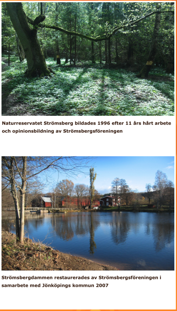 Vi ser natur- och kulturmiljön runt Strömsbergs gård som unik och värdefull för alla kommuninvånare. Vi har restaurerat Strömsbergsdammen i samarbete med Tekniska kontoret på Jönköpings kommun. Vi har anlagt tidsenligt belysning på Strömsbergs gård i samverkan med Jönköpings energi.